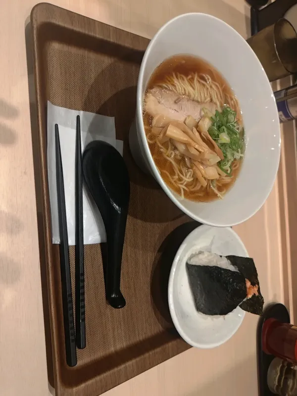 松太郎にて醤油ラーメン大盛りに鮭おにぎりのセット。