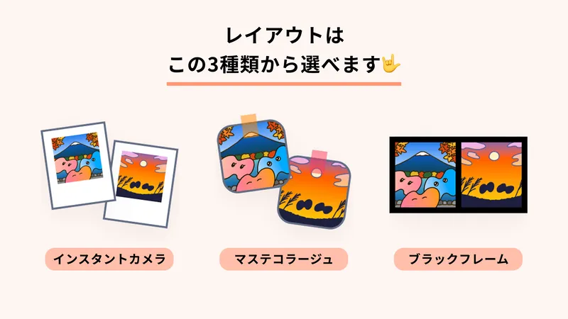 インスタントカメラ、マステコラージュ、ブラックフレームの3種類から🪄