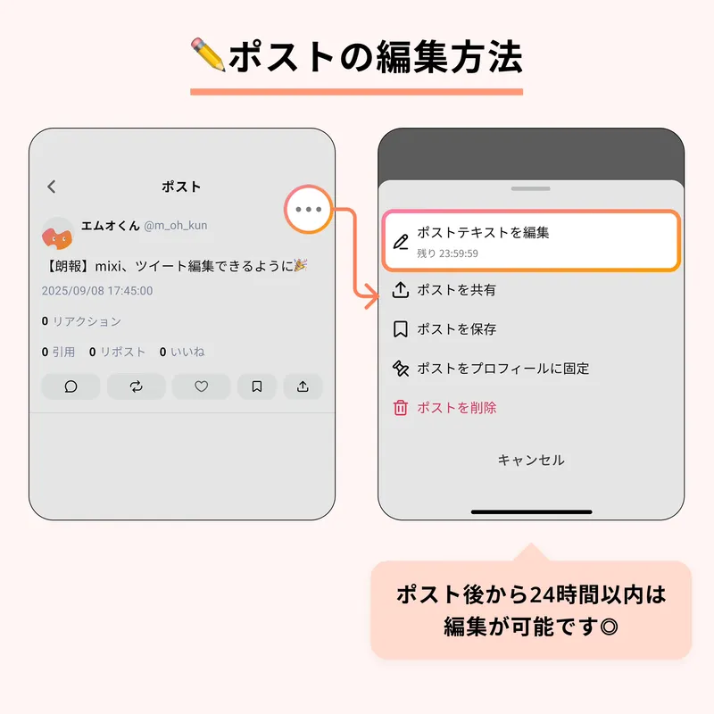投稿後24時間以内なら、テキスト内容を編集できます🕒